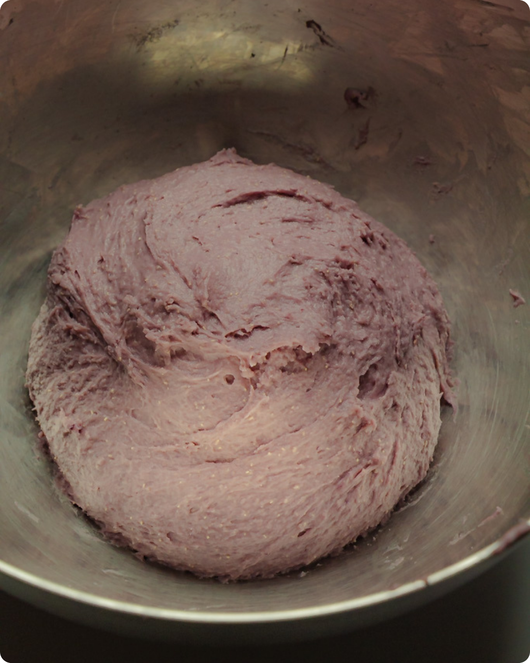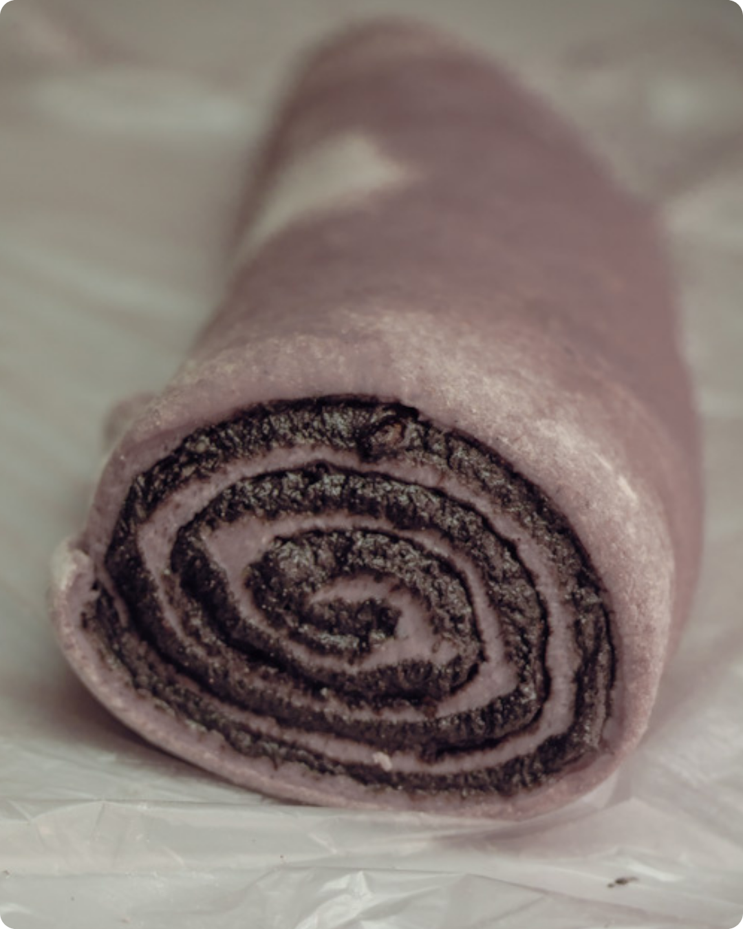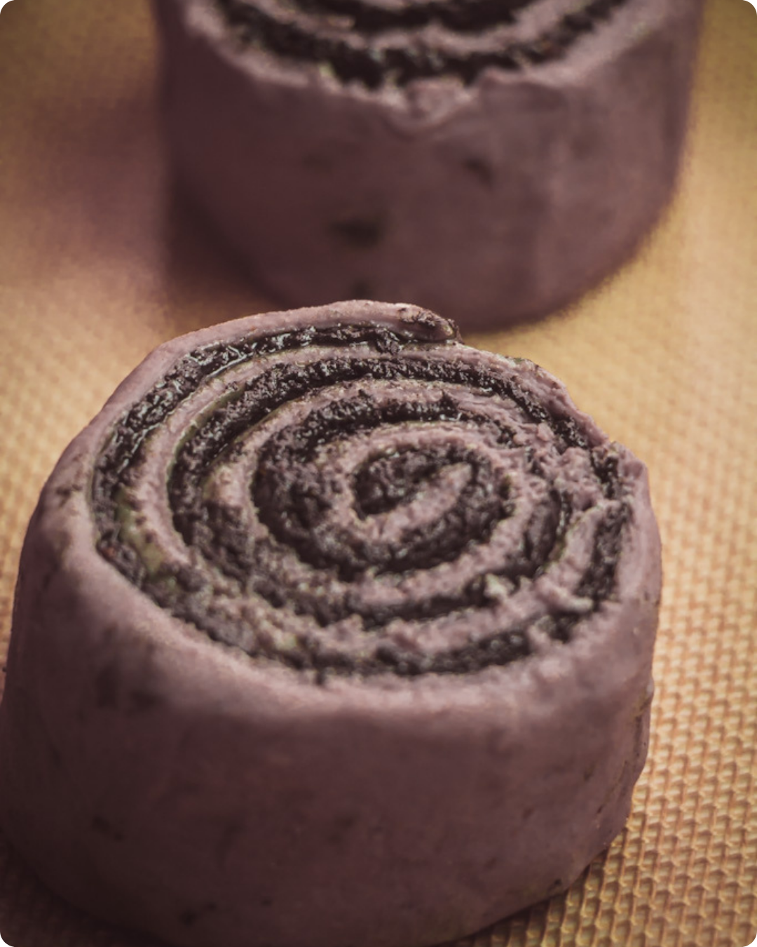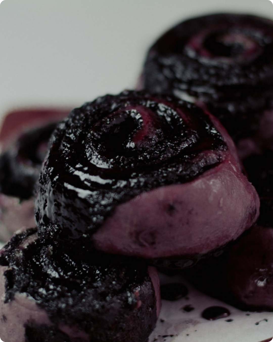 Se você é uma pessoa que sabe das coisas, ao ler que a base de cores desse cinnamon vem de amoras e cacau, rapidamente vai identificar a minha referência/inspiração: o bolo Dark Romance, famoso por combinar amora e chocolate. No meu cinnamon, a massa feita com suco de amora, resulta em um tom lilás e um sabor frutado, com uma acidez delicada que aparece no final. Para o recheio, o toque escuro e misterioso do Cinnamon Roxo vem da canela e do cacau black. Podemos sim ser inventivos, sem depender de corantes industrializados!